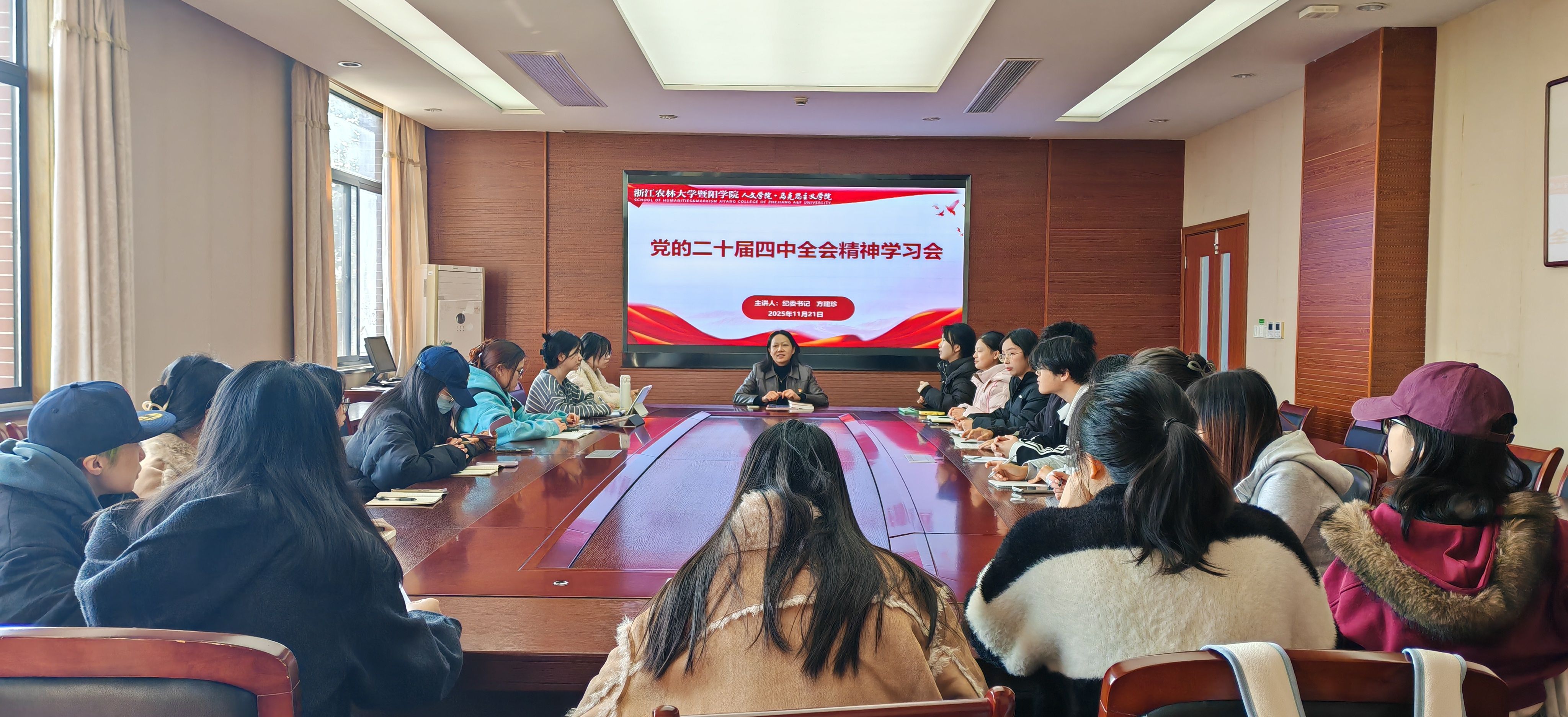 为深入学习贯彻党的二十届四中全会精神,引导广大学生党员将个人理想融入国家发展大局,11月21日,学院纪委书记方建珍在行政楼302为联系支部法学专业学生党支部讲授专题党课。
